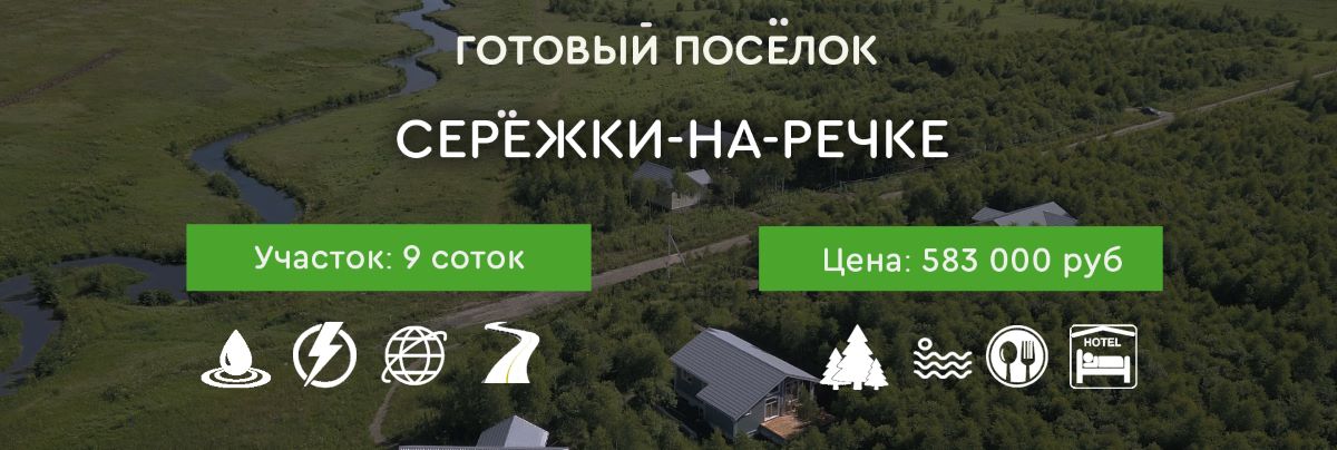 Серёжки-на-речке - это уютная деревенька на берегу небольшой речушки, русская печка, банька, березовая роща, прогулочная тропа, обжитые новые дома и свободные участки. Участки выводятся в продажу очередями, чтобы люди могли построиться в течение года и жить в своих домах комфортно, а не на вечно шумной стройке. Стройте дом, живите в доме или передайте дом в управление поварне Марк и Лев. Такая инвестиция — это возможность вложиться в гостевой дом и получать с него ежемесячный пассивный доход. Дом сдается в номерной фонд поварни Марк и Лев, который берёт на себя всю работу с гостями. Поварня Марк и Лев – это проект команды, создавшей бренд Болотов.Дача, Марк и Лев, Скрытово.Дачи.